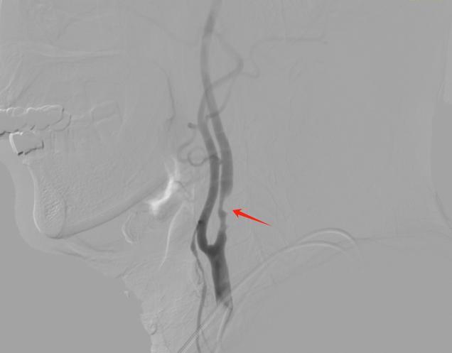 △术前DSA检查,红箭头所示为血管狭窄处