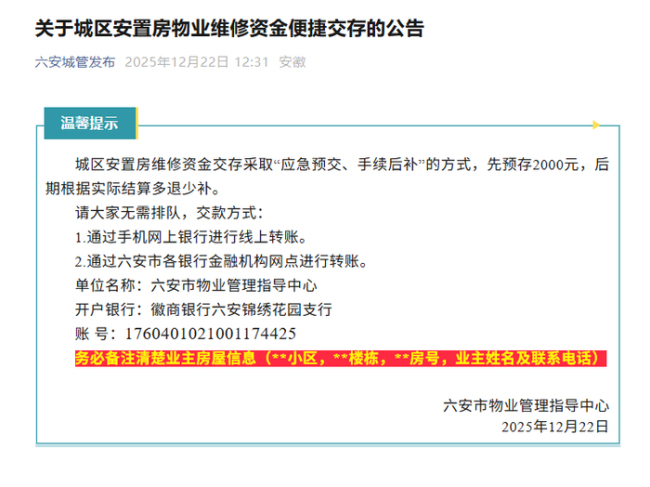 针对维修资金归集窗口出现人员聚集、排队等候时间较长的情况,“六安城管发布”微信公众号于12月21日中午发布提示,宣布自2025年12月22日起实行“应急预交、手续后补”的快速办理模式。次日中午,该公众号又发布了关于城区安置房物业维修资金便捷交存的公告,指出城区安置房维修资金交存采取“应急预交、手续后补”的方式,先预存2000元,后期根据实际结算多退少补。市民无需排队,可通过手机网上银行或六安市各银行金融机构网点进行转账。
